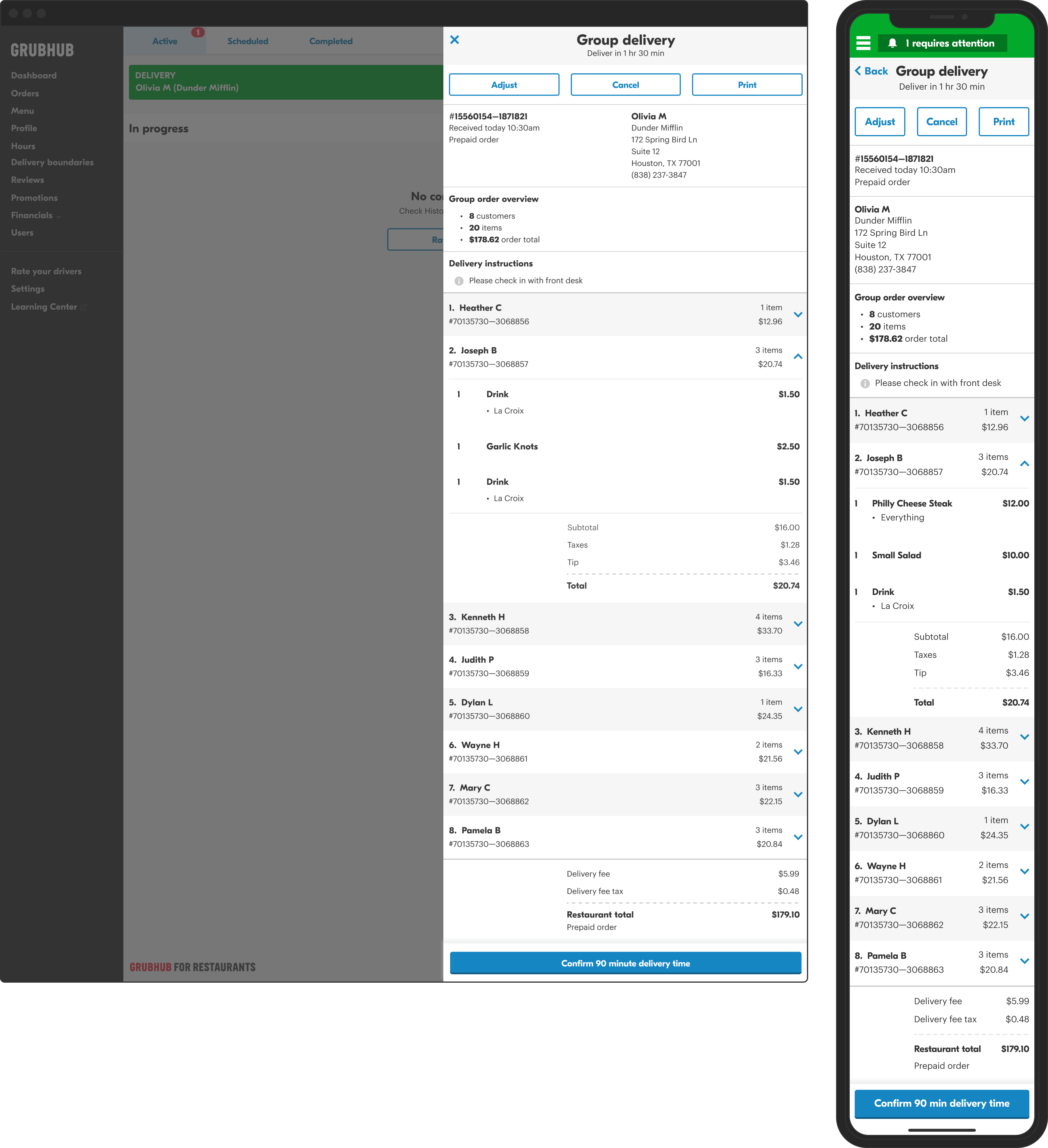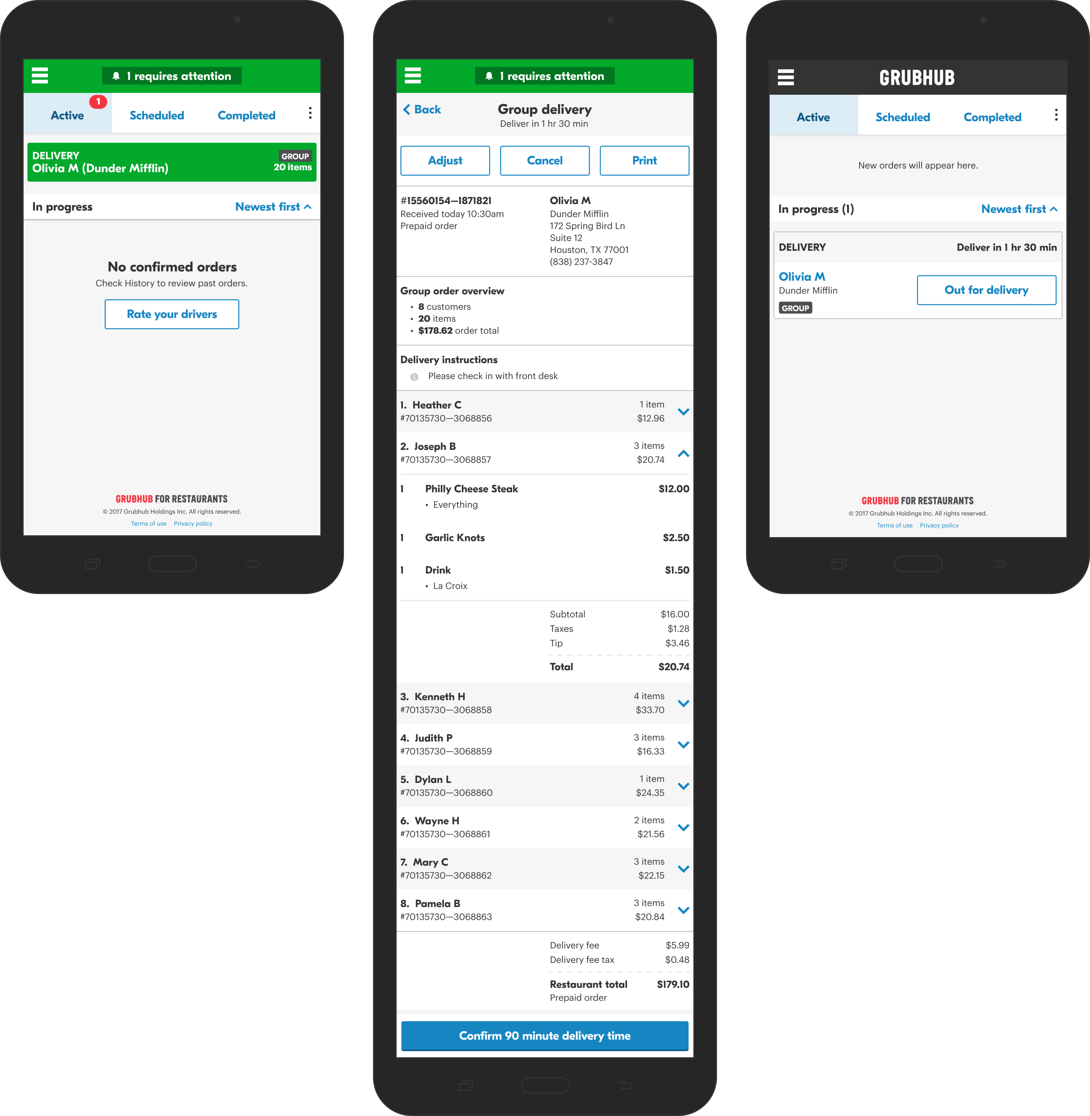 Grubhub for Restaurants, our core product, is the main interface by which restaurants manage their incoming orders, typically managed on an Android tablet provided by Grubhub. We built new functionality for restaurants to manage their corporate group orders alongside the rest of their Grubhub orders.
