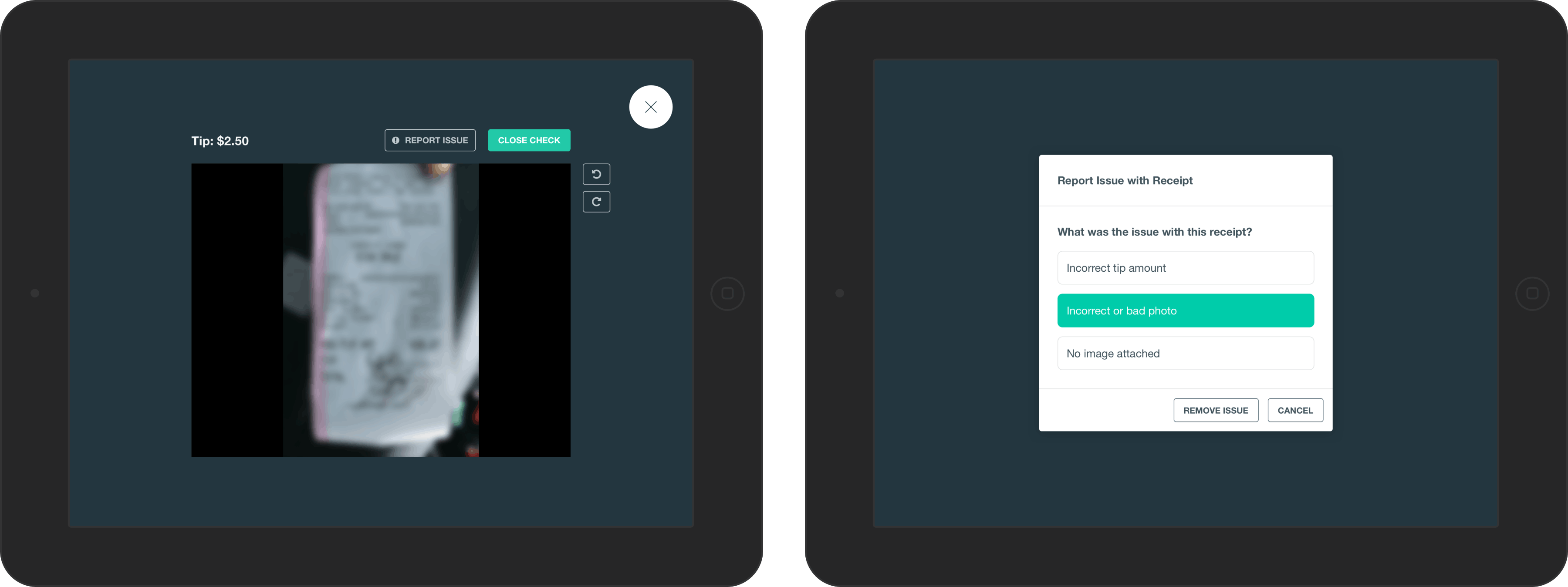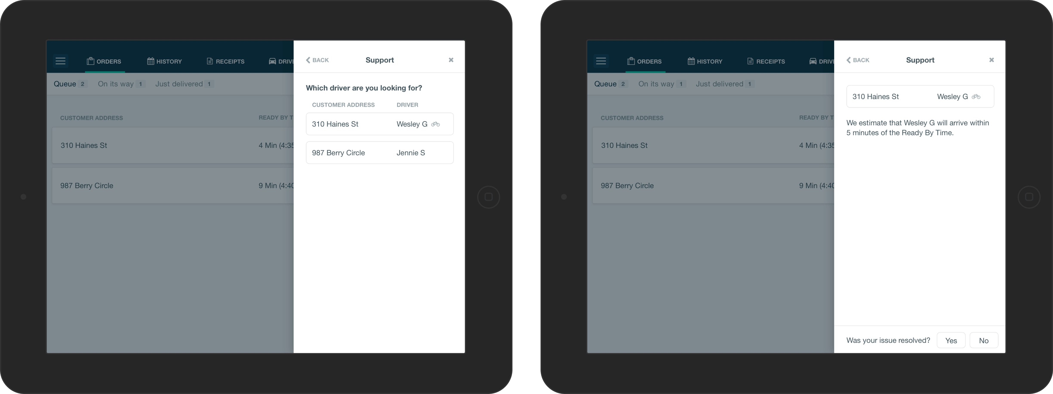 The delivery workflow required drivers to take pictures of receipts, and then had restaurants confirm the tip amount. If there were issues with any photos, restaurants could file a support ticket directly within in the restaurant app.